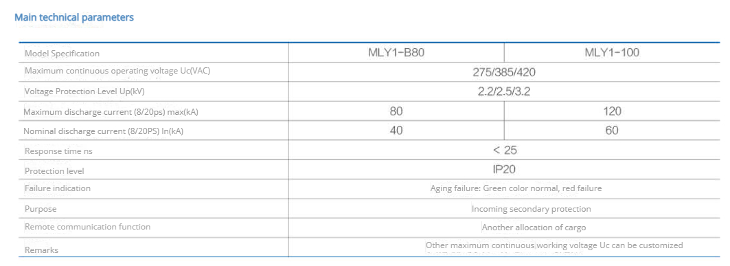 Whether you’re operating within IT, TT, TN-C, TN-S, or TN-CS systems, the MLY1-100 provides robust protection against indirect and direct lightning strikes and other transient overvoltage surges. Compliant with the IEC61643-1:1998-02 Class II surge protective device standard, the MLY1-100 is a reliable choice for ensuring the longevity and safety of your electrical equipment. This device, compliant with the GB 18802.1/IEC61643-1 standard, meets the highest industry standards for performance and reliability, ensuring you can count on it.